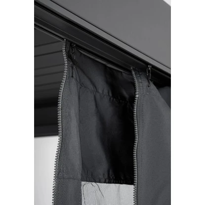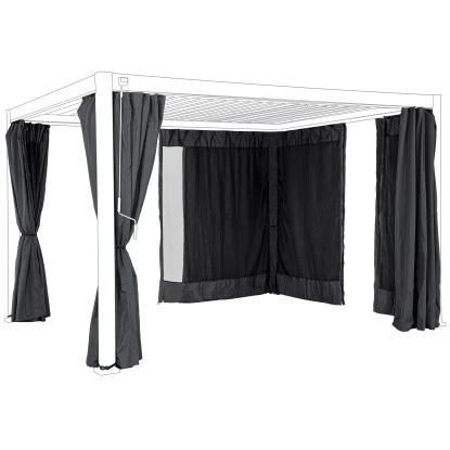 Qualitativ überzeugen Vorhang und Netz durch die Fertigung aus strapazierfähigem Polyester. Dank der pflegeleichten Eigenschaften ermöglichen Sie Ihnen eine einfache Reinigung. Zur Befestigung dienen langlebige und stabile Schienen aus Aluminium. Ausgestattet sind Eckvorhang und Netz zudem mit praktischen Verschlüssen, sodass Sie die Pergola vollständig schließen können. Im Lieferumfang sind vier Vorhänge inklusive.