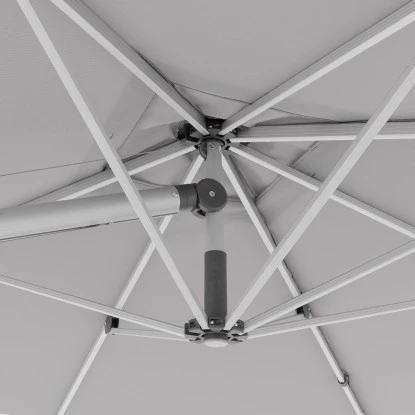 Der Mast und die Streben des Schirms sind aus leichtem, aber stabilem Aluminium gefertigt und exzellent verarbeitet. Dank des Mastdurchmessers von 65 mm hält er auch widrigsten Witterungsbedingungen problemlos stand. Die strapazierfähige Bespannung aus 100 % Polypropylen-Gewebe (220 g/m²) ist robust, abnehmbar und waschbar und zeichnet sich zudem durch eine vorzügliche Lichtechtheit aus, wodurch das Material auch bei starker Sonneneinstrahlung nicht ausbleicht. Mit dem Lichtschutzfaktor des Schirms von UV 80 können Sie den Sommer unbeschwert genießen.