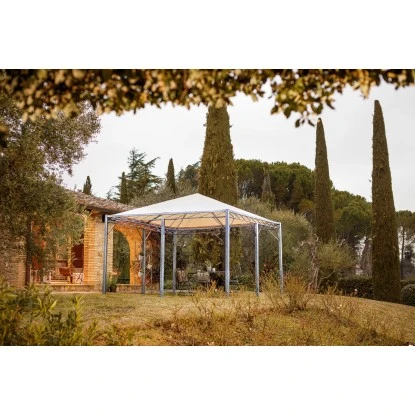 Der Eleo Pavillon Torino misst 4,08 m x 4,08 m. Die Gesamthöhe beträgt 3,10 m. Mit einem Gesamtgewicht von 311 kg ist der Pavillon besonders stabil. Die Montage können Sie selbst vornehmen, sie gelingt dank beiliegender Montageanleitung schnell und einfach. Idealerweise werden Sie von zwei weiteren Personen beim Aufbau des Pavillons unterstützt.
