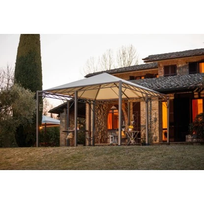 Der Eleo Pavillon Torino misst 4,08 m x 4,08 m. Die Gesamthöhe beträgt 3,10 m. Mit einem Gesamtgewicht von 311 kg ist der Pavillon besonders stabil. Die Montage können Sie selbst vornehmen, sie gelingt dank beiliegender Montageanleitung schnell und einfach. Idealerweise werden Sie von zwei weiteren Personen beim Aufbau des Pavillons unterstützt.