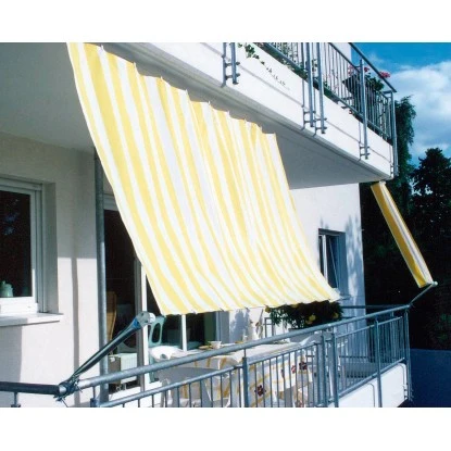 Der Floracord Balkonverkleidungs-Bausatz II beinhaltet ein Segel in Gelb-Weiß mit den Maßen 270 cm x 140 cm (B x T) sowie zwei Edelstahlseile mit max. 7 m Länge, 20 Laufhaken und zwei Klemmhalter mit einer Länge von jeweils 45 cm. Der Bausatz eignet sich für vorgebaute Balkone mit Handlauf und Decke. Er lässt sich unkompliziert am Balkon montieren und ist einfach zu bedienen.