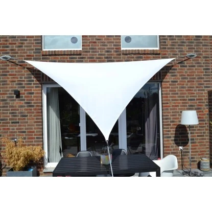 Das Dreiecksonnensegel aus UV-stabilem Polyesterstoff (200 g/m²), mit einem UV-Schutz von 95 % ist bereits mit Spanngurten, für die leichte Anbringung, ausgestattet. Zusätzlich ist das Sonnensegel mit einer schmutz- und wasserabweisenden Beschichtung versehen. Aus diesem Grund sollte das Segel immer mit einem Neigungswinkel montiert werden. Um die Bildung von Wassersäcken zu vermeiden einfach eine Seite deutlich tiefer anbringen.
