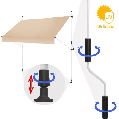 Auch die Bedienung ist kinderleicht. Die Markise wird durch Betätigen der Handkurbel aus- und eingefahren und ist somit schnell einsatzbereit. Die Kurbel kann sowohl links als auch rechts angebracht werden. Der vorherige Aufbau ist schnell gemacht und kinderleicht! Sie klemmen die Halterung einfach in einen Rahmen mit 2-3 Metern Höhe und schon kann die Markise ausgefahren werden.
