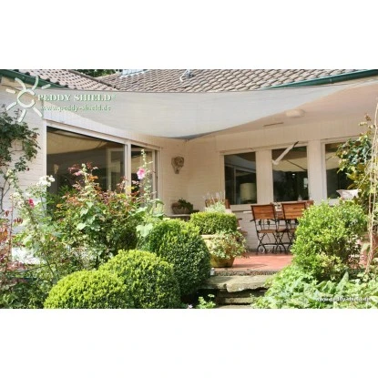 Das Peddy Shield HDPE Dreiecksonnensegel ist durch das HDPE Gewebe besonders robust. Das Schattierungsgewebe ist wind- und wasserdurchlässig. Dadurch verhindert man einen Hitzstau und Pflanzen unter dem Sonnensegel werden trotzdem noch nass. Das Sonnensegel wird mit Spanngurten und fest montierten Edelstahlringen geliefert. Um ein Spannen zu ermöglichen, ist das Segel an den Seiten konkav eingeschnitten. Bei Bedarf kann man das Segel abwaschen.