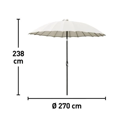 Mittels einer leichtgängigen Kurbelmechanik lässt der Sonnenschirm sich auf einen Durchmesser von 270 cm aufspannen. Durch die Knickfunktion können Sie den Schirm individuell ausrichten, damit er auch bei tiefem Sonnenstand Schatten spendet. Er ist optimal für die Verwendung mit einem Gartentisch, der in der Mitte ein Schirmloch besitz, geeignet. So stört der Schirmständer nicht und alle Sitzplätze am Tisch werden angenehm beschattet.