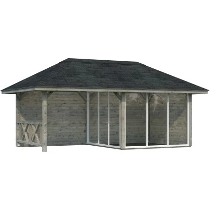 Das Bianca Set verfügt über einen Raum mit zwei geschlossenen Wänden sowie Glasschiebetüren an zwei Seiten und einen Freisitz mit geschlossener Rückwand und seitlichem Geländer. Optional sind ein passender Fußboden (innen und außen), Dachschindeln und eine Regenrinne erhältlich. Das Set wird aus nordischem Fichtenholz gefertigt und die Hölzer sind mit einer grauen Tauchgrundierung versehen. Nach dem Aufbau sollten sie mit einem Endanstrich versehen werden, um sie vor Witterungseinflüssen zu schützen.