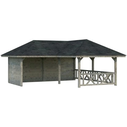 Der Palmako Pavillon Bianca Set 1 mit einer Fläche von 24,9 m² bietet ausreichend Platz für eine großzügige und luftige Lounge. Die Rück- und Seitenwand gewährleisten Sicht- und Windschutz, während das Geländer an den Seiten eine klare Abgrenzung schafft. Das Set zeichnet sich durch seine luftige Wohlfühlatmosphäre aus und wird aus nordischem Fichtenholz gefertigt.