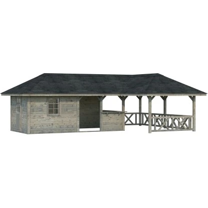 Optional können Sie einen passenden Fußboden für den Innen- und Außenbereich sowie Dachschindeln und eine Regenrinne erwerben, um den Pavillon weiter anzupassen und vor Witterungseinflüssen zu schützen.
