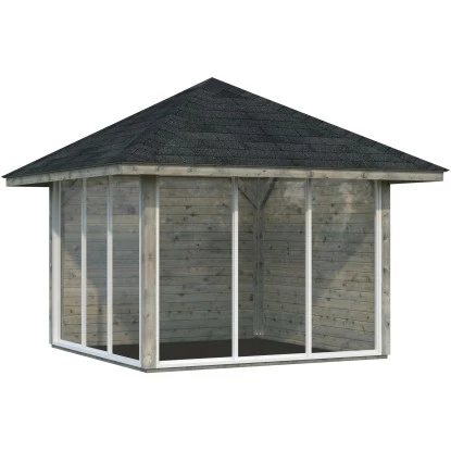 Optional sind ein passender Fußboden, Dachschindeln und eine Regenrinne erhältlich. Die Hölzer sind mit einer braunen Tauchgrundierung versehen und sollten nach dem Aufbau mit einem Endanstrich versehen werden, um sie vor Witterungseinflüssen zu schützen.