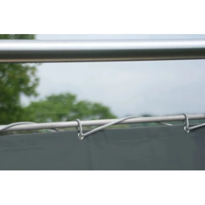Die Peddy Shield Polyester Balkonumrandung 65 x 300 cm Anthrazit wird aus 280 gr schwerem Polyestergewebe gefertigt. Mit Hilfe der mitgelieferten Kordel und der Metallösen wird die Balkonverkleidung am Geländer befestigt. Die Teflonbeschichtung des Textils ist wasser- und schmutzabweisend. Zudem verfügt der Stoff über einen UV-Schutz und ist bei 40 Grad waschbar.