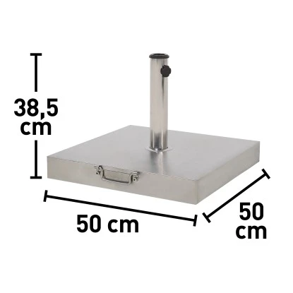 Dieser Schirmständer dient als stabile Halterung für einen großen Sonnenschirm und verhindert das Umkippen des Schirmes bei Wind. Er zeichnet sich durch eine quadratische Form aus und besitzt ein Eigengewicht von 40 kg. Geeignet ist der Schirmständer für Schirme mit einer Größe bis 300 cm x 300 cm (B x T). Durch den Kombi-Adapter lässt er sich für Schirmmaste mit einem Ø von 35 bis 48 mm nutzen. Für seine Herstellung kommt Beton mit einer Edelstahlummantelung zum Einsatz. Gestaltet ist der Schirmständer in der Farbe Silber.
