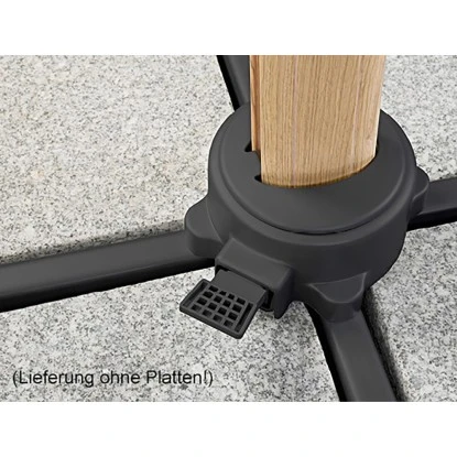 Im Lieferumfang enthalten ist ein Plattenständer für 4 Wegeplatten in der Größe 50 x 50 cm x 5 cm (Platten nicht enthalten), welcher dem Schirm einen sehr stabilen Halt gibt. Optional können Sie zu dem Schirm auch die extra für Ampelschirme hergestellten Einlegeplatten für Ständerkreuze, eine Bodenplatte zum Einbetonieren, einen Bodenanker zum Eingraben, einen Bodendübel zum Eindrehen oder unseren fahrbaren Ampelschirmständer nutzen. Zu dem fahrbaren Ampelschirmständer kann eine Lenkstange dazu erworben werden, welche das mühelose Bewegen des Schirmständers ermöglicht. Durch unsere Ampelschirm-Windsicherung wird die Schwankbewegung durch Wind und somit die Belastung auf das Schirmgestell reduziert.