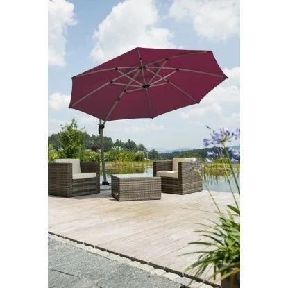 Der hochwertige Sonnenschirm Rhodos von Schneider in Bordeaux mit seiner klassischen achteckigen Form bringt ein elegantes Design in Ihren Garten oder auf Ihre Terrasse. Als optimal einstellbarer Schattenspender sorgt er für ein geselliges Beisammensitzen bei angenehmen Temperaturen. Dank seines seitlich befindlichen Schirmmastes geht kein Platz verloren, sodass Ihnen eine frei nutzbare Fläche unter dem Schirm zur Verfügung steht. So bekommen Sie leicht Ihre Sonnenliegen oder auch eine ganze Möbelgruppe zum Essen, Plaudern und Entspannen untergebracht.