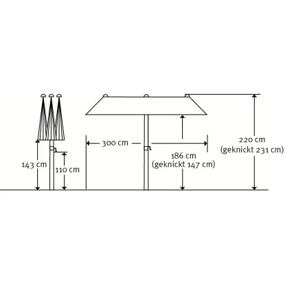 Die Kurbelmechanik ermöglicht Ihnen ein bequemes Öffnen und Schließen des Balkonschirms. Aufgespannt besitzt er eine Größe von 150 cm in der Breite und 300 cm in der Tiefe. Damit Sie den Schirm auch bei niedrigem Sonnenstand morgens und abends perfekt für einen idealen Schattenplatz ausrichten können, lässt er sich am Mast abknicken bzw. neigen. Die Höhe des Sonnenschirms beträgt maximal 220 cm.