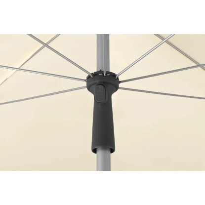 Zudem verfügt der Schirm Locarno über einen Drehfeststeller mit dessen Hilfe Sie die Höhe problemlos nach Bedarf verstellen können. Alle Kunststoffteile wie das Top, der Schieber und der Drehfeststeller bestehen aus anthrazitgrauem Kunststoff, welches farblich sehr gut mit dem silbergrauen Gestell harmoniert. Außerdem besitzt der Schirm einen stabilen Metallknicker mit Druckknopf, wodurch ein müheloses Abknicken gewährleistet wird und der Schirm so entsprechend der Sonneneinstrahlung ausgerichtet werden kann. Um einen sicheren und stabilen Stand zu gewährleisten, sollte ein Schirmständer mit einem Mindestgewicht von ca. 20 kg verwendet werden.