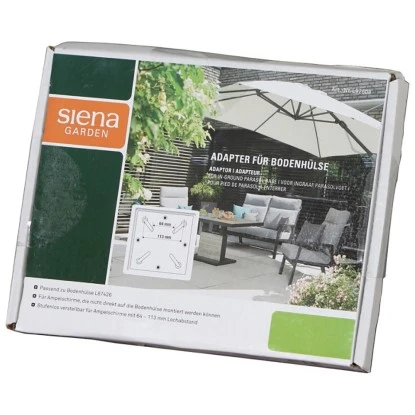 Universale Adapterplatte in Verbindung mit der Siena Garden Earthbase kompatibel für alle Ampelschirme. Die mit 4 Schrauben auf dem Sockel zu befestigen sind der Lochabstand kann stufenlos zwischen 76 und 113 mm variieren Siena Garden N+ Ampelschirme können ohne Adapterplatte montiert werden Stahl in anthrazit für Ampelschirme bis 300×300 cm oder Ø 350 cm.