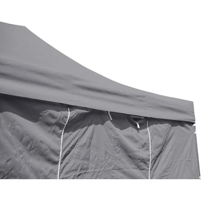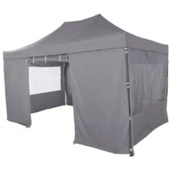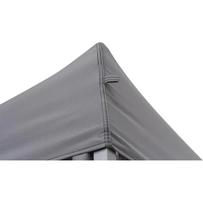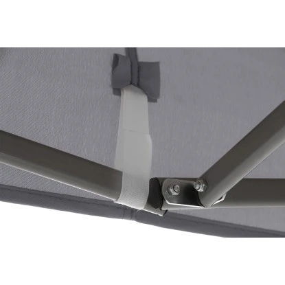 Das Stahlgestell ist pulverbeschichtet in der Farbe grau. Die Pfosten haben die Abmessungen 25×25 mm. Das Dach ist aus Polyester, 160 g/m² und ist PU-beschichtet in der Farbe grau. Inklusive 4 Seitenteile Seiten mit großen Panorama-Fenstern. Eine lange Seite ist mit einem Eingang zum Aufrollen und eine lange Seite ist voll geschlossen. Inklusive Spannseilen und Heringen und Tragetasche.