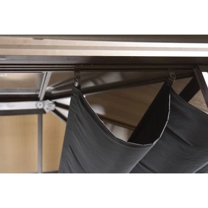 Der Sojag Aluminium Pavillon Castel 10 x 12 Bronze ist modern, langlebig und besticht durch seine tolle Optik. Er besitzt außergewöhnliche 125 kg/m² Schneelast und dauerhaft rostfreie Aluminiumteile. Das Dach besteht aus 8 mm starken Doppelsteglatten, ist wasserdicht und hält Witterungen wie Regen, Schnee oder Sonne (UV) problemlos Stand. Das gleiche gilt für die massive Konstruktion aus resistentem, pulverbeschichtetem Aluminium (Pfostenstärke 7,6 cm). Selbst die Schrauben bestehen aus rostfreiem Edelstahl. Der Pavillon muss daher im Winter nicht abgebaut werden. Er ist rundherum mit Alu-verstärkten Moskitonetzen ausgestattet. An allen 4 Seiten befindet sich jeweils eine Doppel-Schiebetür (Öffnungsmaße: schmale Seite 100 cm x 210 cm, breite Seite 165 cm x 210 cm). Zum Schutz vor Sonne ist der Pavillon mit einem Raffdach ausgestattet, welches mit einem Handgriff beliebig gespannt werden kann.